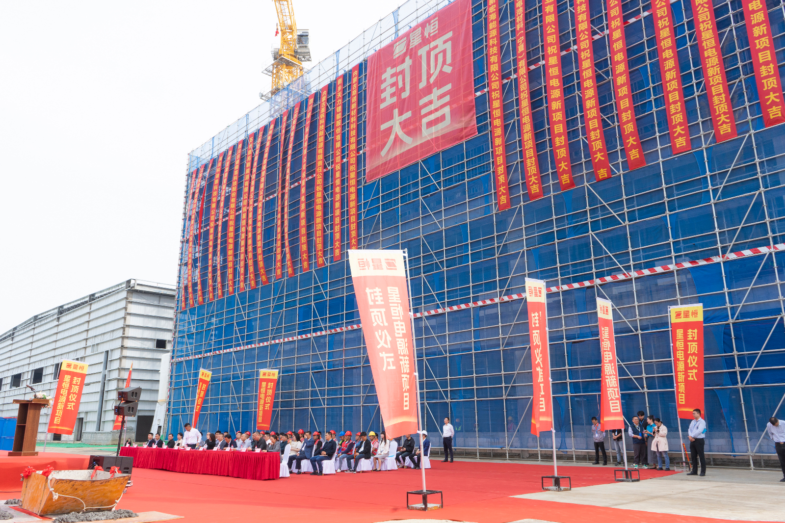 中新蘇滁高新技術產(chǎn)業(yè)開發(fā)區(qū)黨工委書記楊廣蘭,黨工委委員郭永付、劉軍章、王憲亮、呂躍躍,中新蘇滁(滁州)開發(fā)有限公司副總裁左磊,園區(qū)管委會經(jīng)濟運行局、投促局、建設局等相關部門領導,星恒電源股份有限公司董事長兼總裁馮笑,首席技術官王正偉,首席財務官嚴永芳,以及星恒管理干部、員工代表等出席封頂儀式。