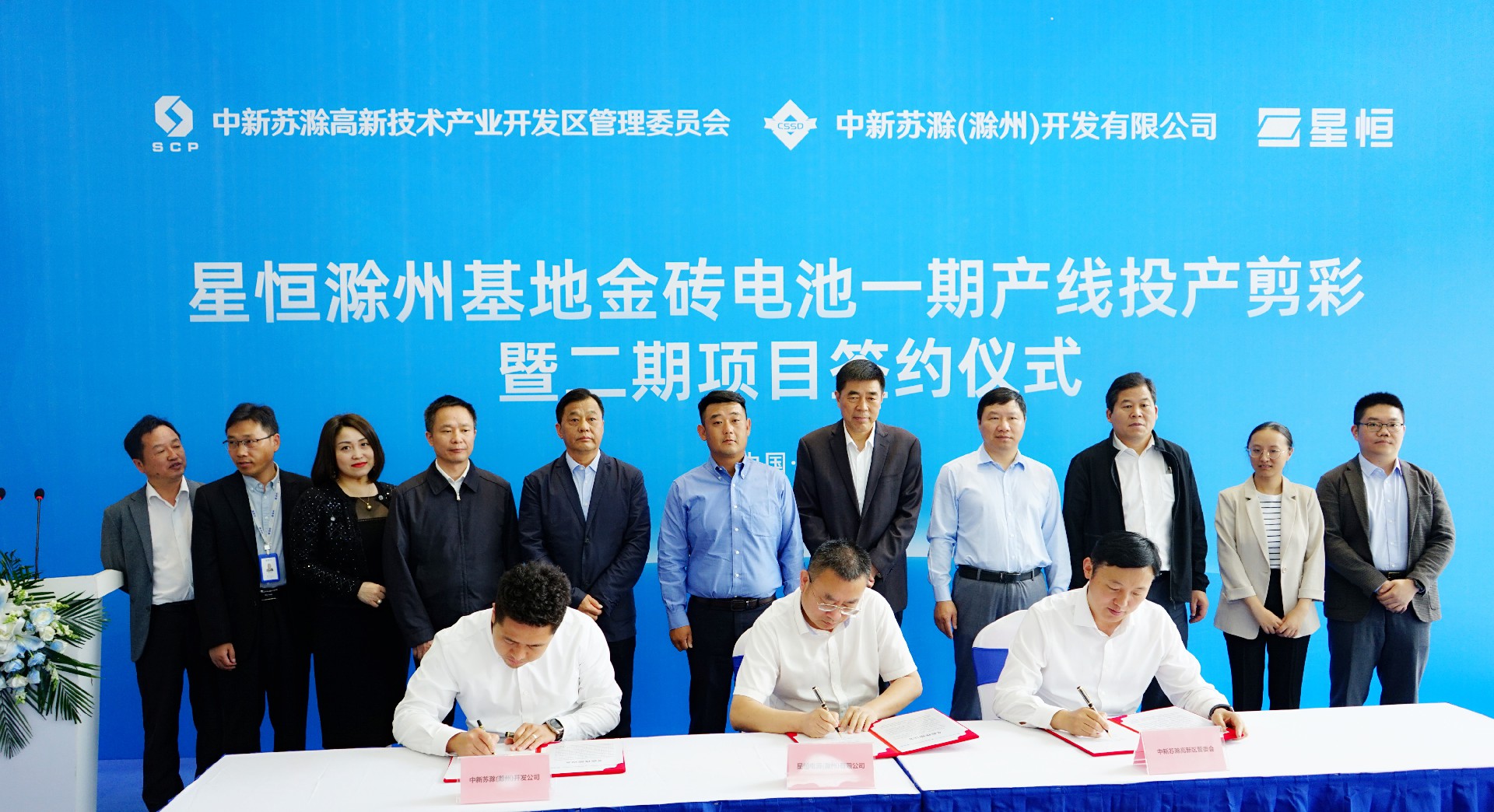中新蘇滁(滁州)開發有限公司總裁何建埠,滁州市政協秘書長蔣新志,滁州市科技局局長周成東,中新蘇滁高新區黨工委副書記劉東、滁州市投資促進局副局長黃海,中新蘇滁高新區管委會副主任劉軍章,星恒電源股份有限公司董事長兼總裁馮笑,大電芯工程院院長王正偉、公共關系中心總經理史小行,董事會秘書王玉,滁州基地一廠總經理戚思龍等領導出席剪彩及簽約儀式。